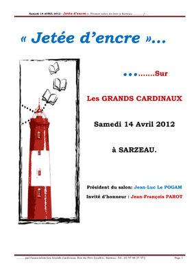 Le premier salon du livre de Sarzeau, organisé par l'Association des Grands Cardinaux, dont la présidente est Laurence Daveau, se déroulera le samedi 14 avril 2012, rue du Père Coudrin. Président Jean-Luc Le Pogam, invité d'honneur Jean-François Parot