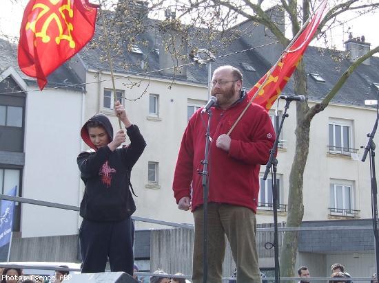 Ont pris la parole Patrick Hervé [photo2], président de « Diwan Breizh », Yannick Baron [photo4], président de « Dihun », Patrick Malrieu [photo5], président du « Conseil Culturel de Bretagne », Frédéric Ledouble [photo6], président et porte-parole de l'association « Babigoù Breizh » et Lionel Bonis [photo7], journaliste, délégué syndical « SUD médias, pour FR 3 » (Solidaires Unitaires Démocratiques), qui dénonça l'indigence croissante des programmes et des productions en langue bretonne de la chaîne. Enfin, « un couple d'Occitans » [photo8], venu de Béziers soutenir les Bretons dans une cause similaire à la leur, en remerciement de leur récent déplacement en Occitanie.