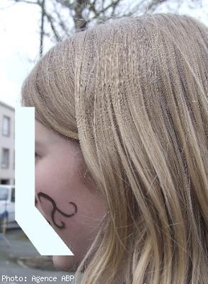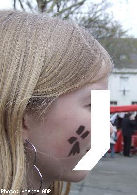 Les enfants, les plus directement concernés par les revendications pour le présent et l'avenir de la langue, étaient venus en grand nombre soutenir les adultes, parents et sympathisants. Pour eux cette manifestation était une vraie fête. Plusieurs portaient des chapeaux de fantaisie. Leurs panneaux de carton ondulé peint tenaient souvent de l'œuvre d'art [photos 10 à 12]. Des joues et des fronts étaient décorés d'hermines et de triskells [photos 13 et 14].