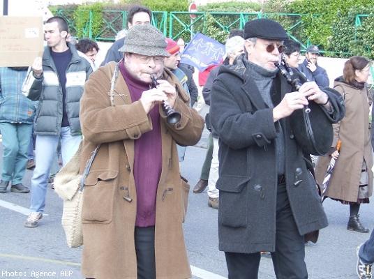 En début de cortège les plus jeunes suivaient les ''anciens'' de Diwan, qui ont créé l'association « Diwanet » et tenaient la banderole « Justis evit Diwan ! » [photo15]. Aucun ne manqua de souffle pour interpréter à tue-tête et de façon très libre des chansons en breton, dont « Gwir Vretoned (tud a galon, war zav !) ». Et comme il n'y a pas de manifestation en Bretagne sans musique, un mini-bagad de jeunes sonneurs faisait partie du cortège [photo16], ainsi que Yann Goasdoué, ancien talabarder des Diaouled ar Menez et son compère, en sonneurs de couple, qui nous interprétèrent entre autres la belle complainte « Marig ar Pollanton » [photo 17 en dernière page photo].