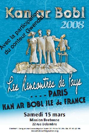 Le 5e Kan ar Bobl Île-de-France, rencontre de tous les acteurs franciliens œuvrant au rayonnement des chants et musiques de Bretagne - aura lieu le samedi 15 mars 2008 à 14 heures à la Mission Bretonne - Ti ar Vretoned