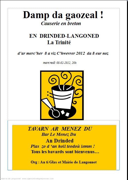 Kaozeadeg en Drinded-Langoned d'an 08/02 en tavarn "Ar Menez Du" da 8 eur noz.