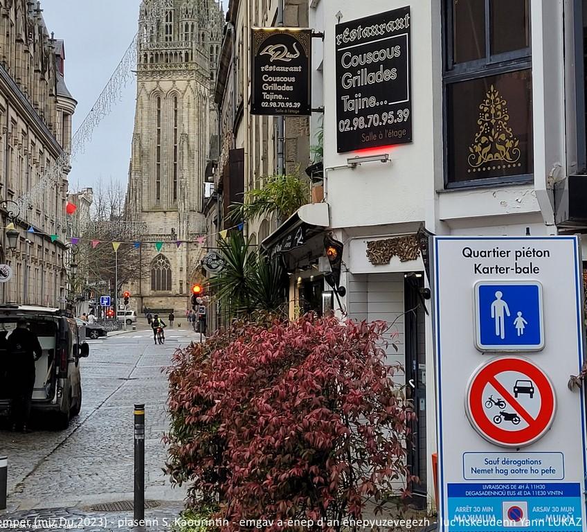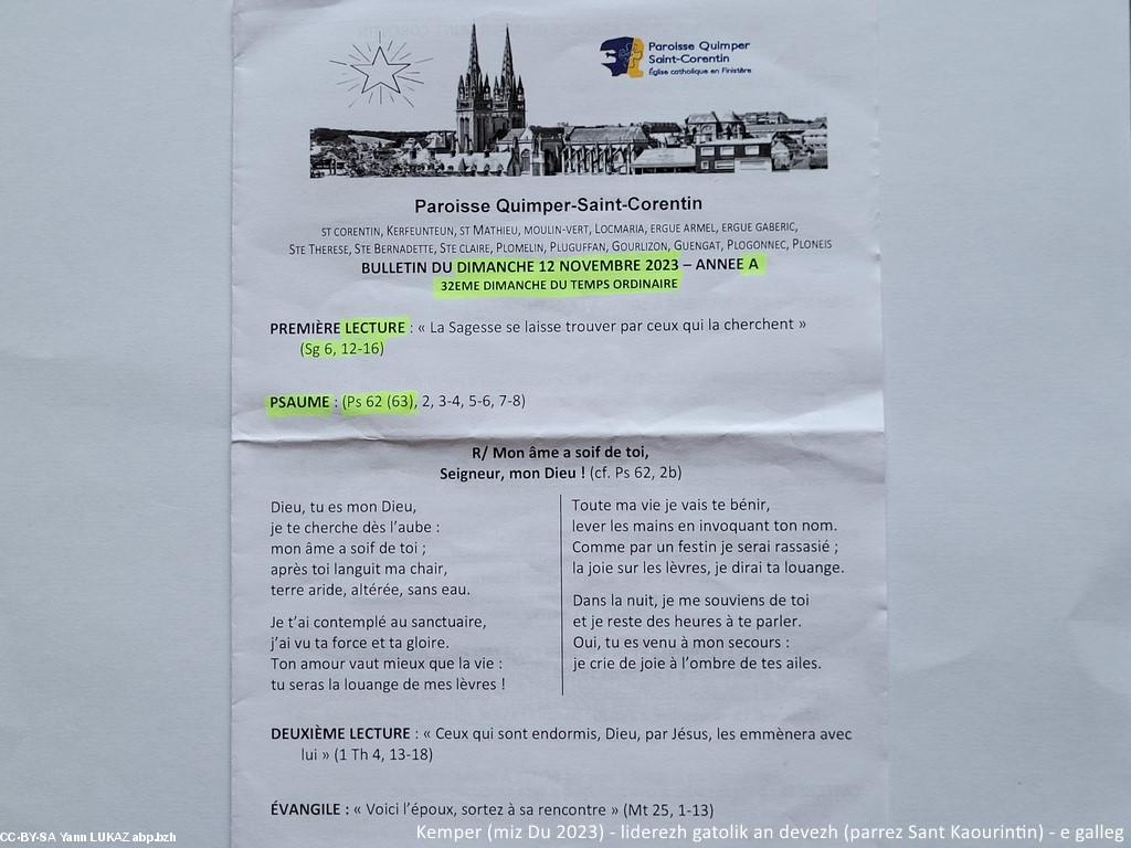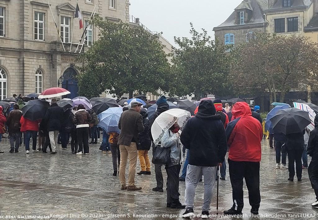 Distroomp war blasenn Sant Kaourintin e Kemper, ar Sul-mintin-mañ (12vet a viz Du 2023). Glav, glav-puilh a oa. Pet a zisglavierioù digor braz dirak maerez Kemper ? Daou pe dri c’hant, pe muioc’hik c’hoazh ? Me ne ouian ket.. E-tal d’an Ti-kêr diouzh un tu, e-kichen Iliz-veur Bro-Gerne diouzh un tu all. Emañ ar vaerez o prezeg evel ma c’hell. Kroget eo e 11 eur vintin, evit ur c’hard-eur bennak. Diouzh he genoù, ingal, alies-alies e vez anv eus « antisémitisme », kazi e bep eil frazenn, pe dost… Ar pezh a ouian-me eo e-pad an amzer-mañ ez eus un overenn e-barzh an iliz-veur. Kroget eo e 10eur hanter, evit un eurvezh. Da lâret eo, o paouez tremenet eo al lennadennoù. (lodenn gentañ an overenn). Pere ? Sellit ’ta. Evel da gustum, div destenn a teu deus ar Bibl yuzev.