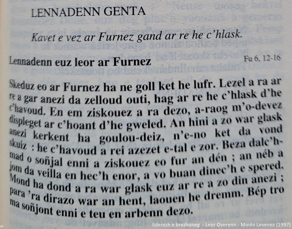. Al lennadenn gentañ a teu deus unan eus levrioù ar bibl yuzev. Er wezh-mañ eo eus levr ar Furnez.
