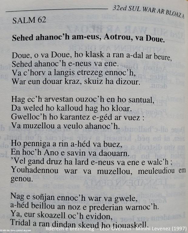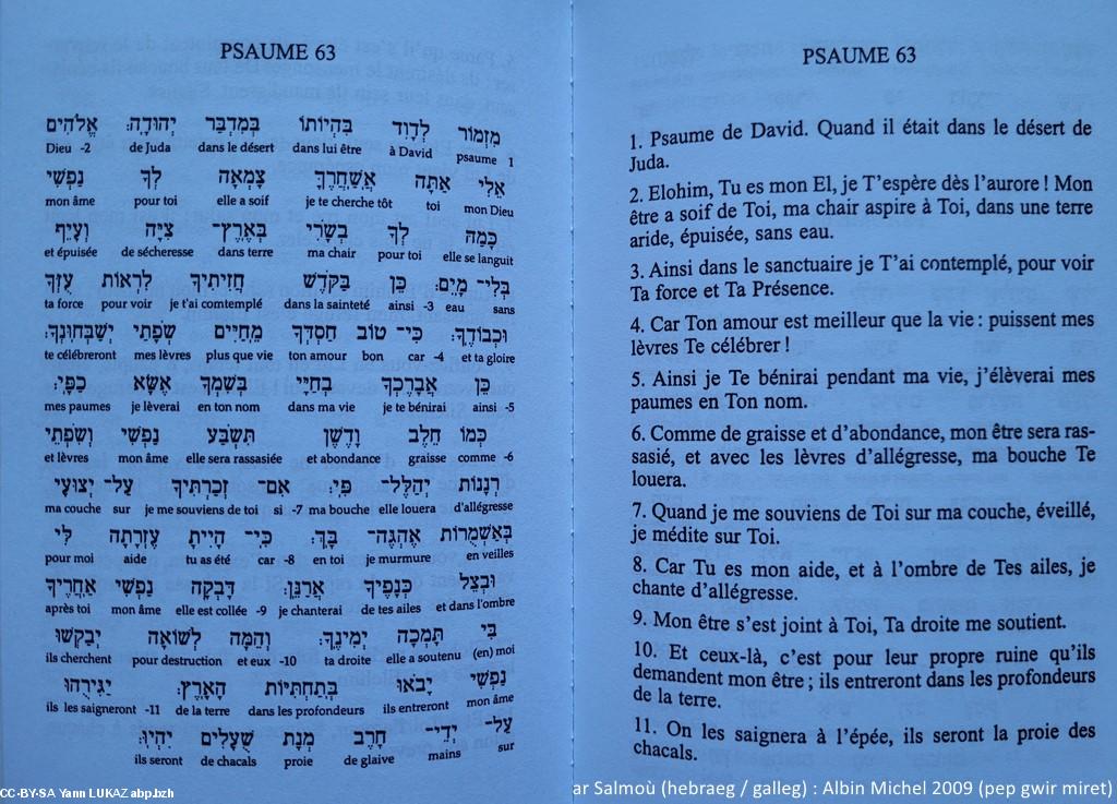 Doue, o va Doue, ho klask a ran a-dal ar beure, Sec’hed ac’hanoc’h en deus ma ene Ma c'horf a langis etrezek ennoc’h War un douar kraz, skuizh ha dizour . Hag ec’h arvestan ouzhoc’h en ho santual, Da welet ho kalloud hag ho kloar. Gwelloc’h ho karantez eget ar vuhez : Ma muzelloù a veulo ac’hanoc’h. . Ho pennigañ a rin a-hed ma buhez, En hoc’h Anv e savin ma daouarn. Evel gant druz ha lard en deus ma ene e walc’h ; Youc’hadennoù war ma muzelloù, meuleudioù em genou. . Nag e soñjan ennoc’h war ma gwele, a-hed beilhoù an noz e prederian warnoc’h. Ya, ur skoazell oc’h evidon, Tridal a ran dindan skeud ho tivaskell.