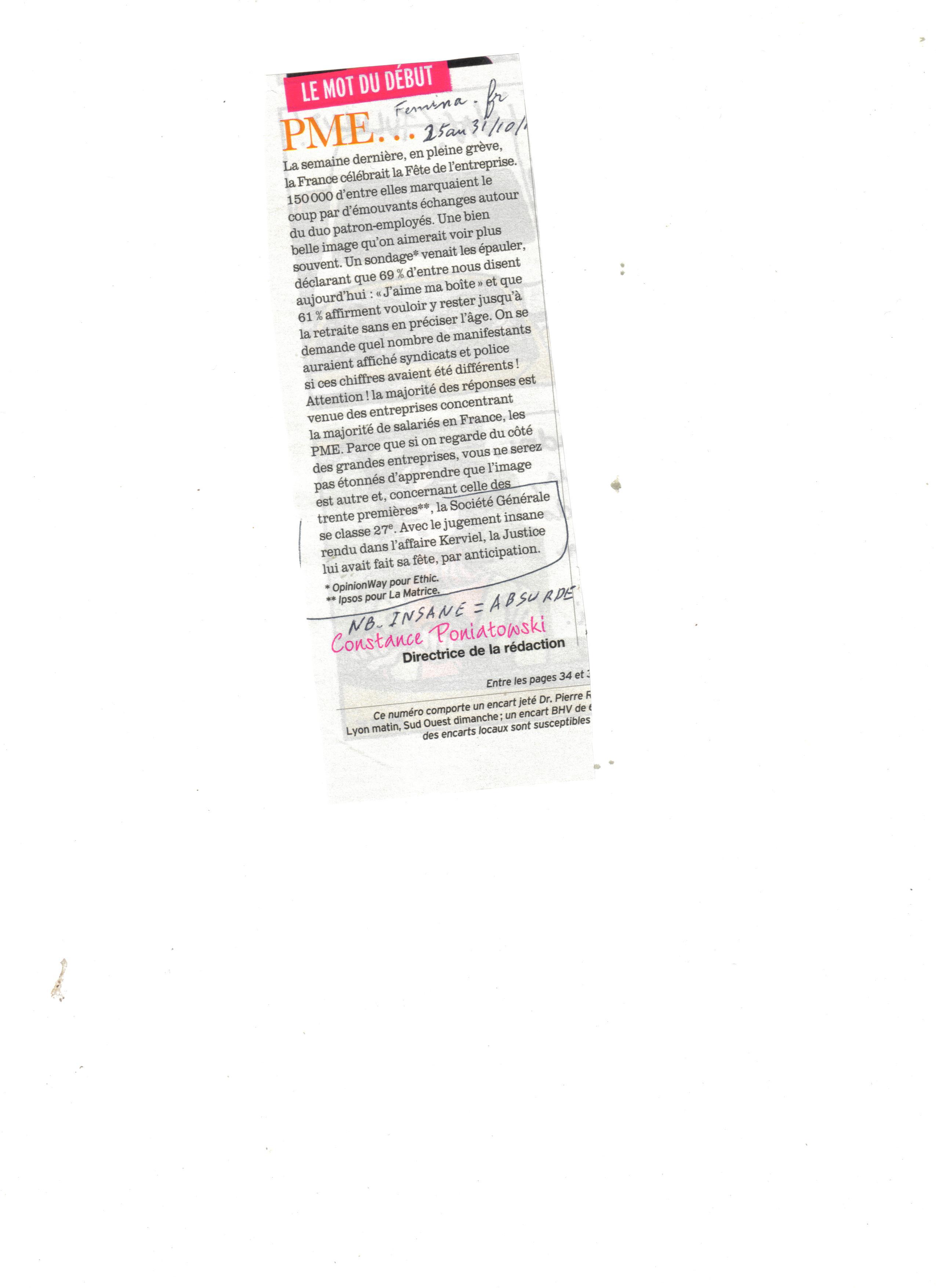 Jérôme Kerviel nous a écrit. Il tient à remercier les centaines de personnes qui le soutiennent et l’encouragent. Il dit qu’il a été très bien défendu par Me Metzner et son équipe. Si la jurisprudence, notamment sur l’abus de confiance, lui était favorable, Me Metzner fut le seul à penser à utiliser cette défense. Ceci, dit-il, n’a pas été repris par la presse qui s'en est pris à sa défense (ndlr : qui finance la presse ?)