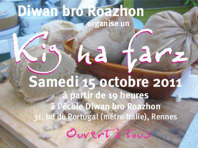 L'école Diwan Bro Roazhon organise le samedi 15 octobre 2011 dans ses locaux à Rennes un kig ha farz ouvert à tous.