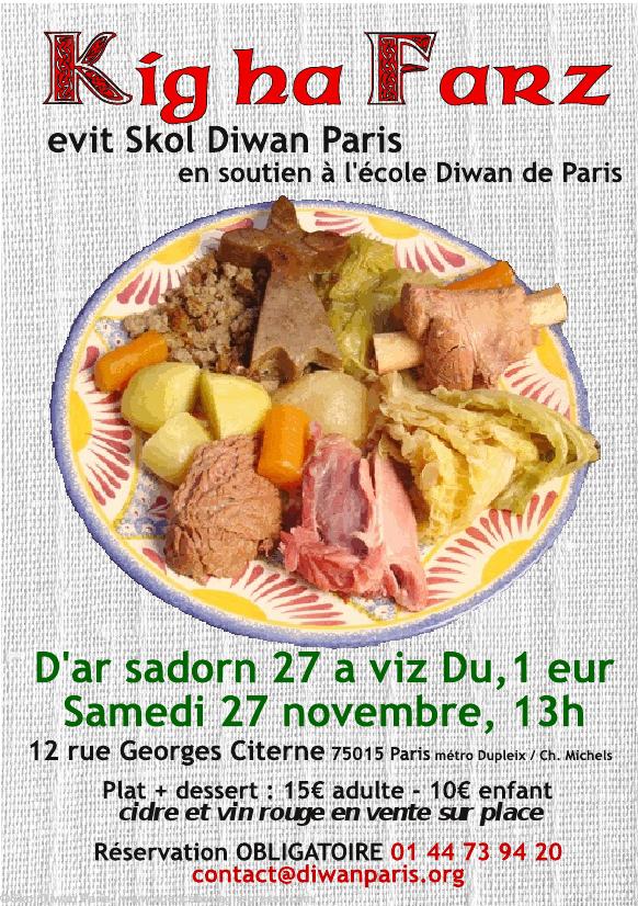 Joignez l'utile à l'agréable! Venez vous régaler et soutenez notre école maternelle et primaire bilingue français-breton Samedi 27 novembre, 13 h Plat + dessert : 15 € adultes / 10€ enfants Vin rouge et cidre en vente sur place Inscription obligatoire : contact@diwanparis.org 01 44 73 94 20 (responter - répondeur)