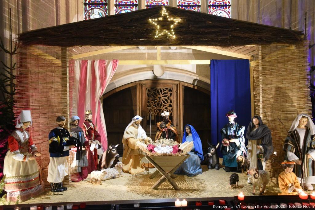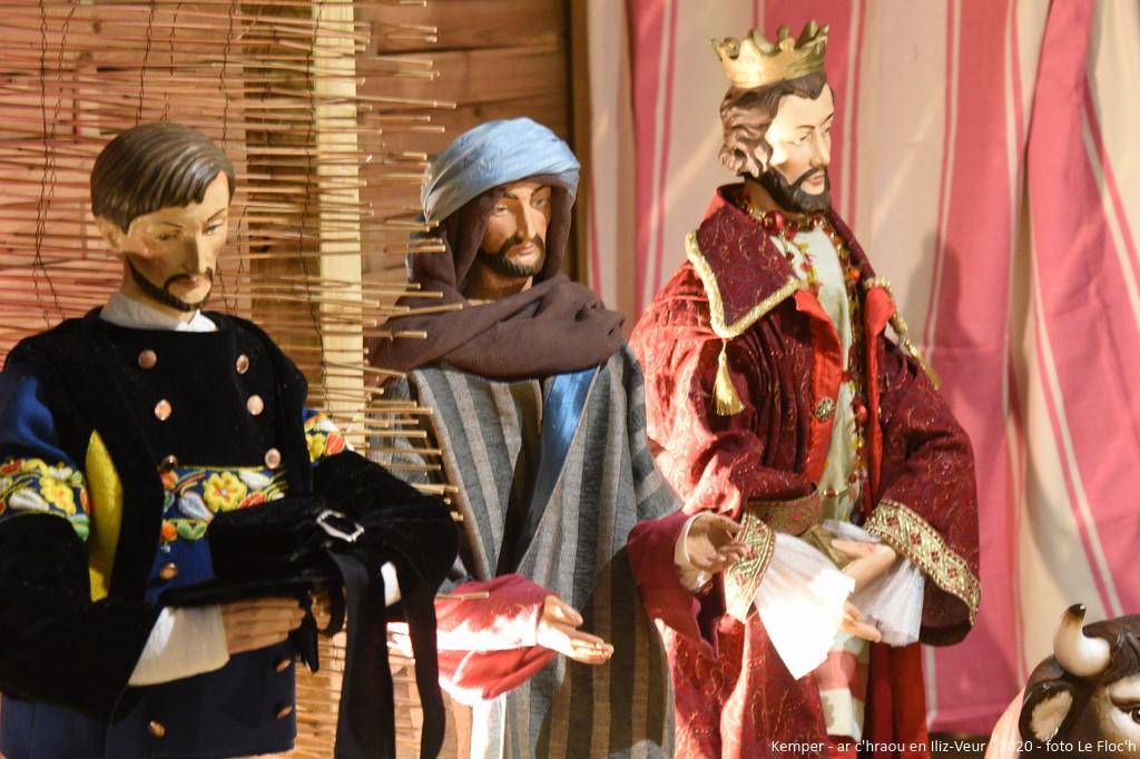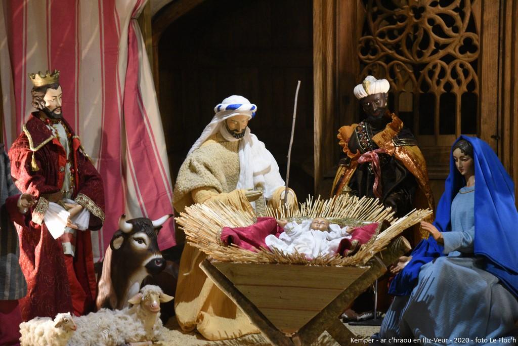 Distroomp da Gemper. Ar wech-kentañ eo e welan ar c’hraoù en iliz-veur. Ha pebezh souezhadenn, peseurt dudenn zo e-kreizig ar c’hraou, rik, etre Josef ha Mari, a-dreñv d’ar Mabig Jezuz? Ar Maj du e groc’hen! Mat, hervez an hengoun poblek unan eus an tri Maj a zo du, sañset. Mes e-kreizig ar c’hraou, e-tal-din, amañ ha bremañ! Soñjal a ra din en un den all, du e groc’hen, toullbac’het en tu all da Meurvor Atlantel. Dister-kenañ eo deuet da vezañ e yec’hed, ha braz eo e foanioù er mare-mañ. Nedeleg evitan, er bloaz-mañ? En ospital-toullbac’h, e-unan-penn, staget ouzh e wele. Distroet eo en e gellig, evit poent. Ma weloc’h ac’hanon lakaat ur penn-gouloù bihan e kornig-pedenn un iliz, na c’houlennit ket diganin evit piv eo. Mar plij. Evit ur mignon a-bell o strivañ evit e vuhez eo.