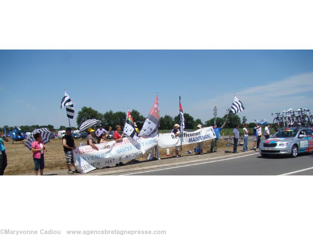 La caravane publicitaire passe et les Bretons crient « Bienvenue en Bretagne » à chaque passage des véhicules. Nous recueillons des messages approbateurs des sonos embarquées, sauf celles des camions de la presse : Aujourd'hui en France, Ouest France… Il fallait s'y attendre. Petite provocation de la part des voitures du Conseil Général de Vendée qui osent s'aventurer à 2 km en Loire-Atlantique et se permettent de distribuer le drapeau-logo du département de Vendée ! Mais à notre vue, ils semblent ne pas vouloir franchir le carrefour. Pour faire comprendre notre action aux 500 spectateurs et les informer, nous distribuons les tracts du 18 juin, dont l'argumentaire à l'intérieur est toujours valable, en expliquant l'accueil du Tour en Pays de Retz, pays breton. Il suffit de regarder son drapeau. Quelques grincheux mais pas de problème pour la plupart.