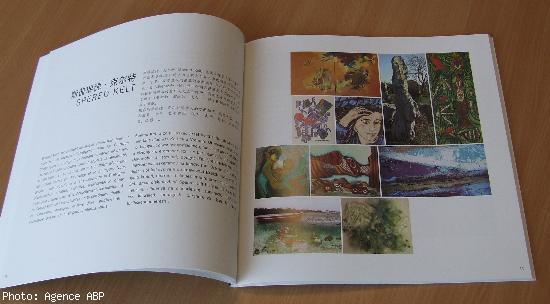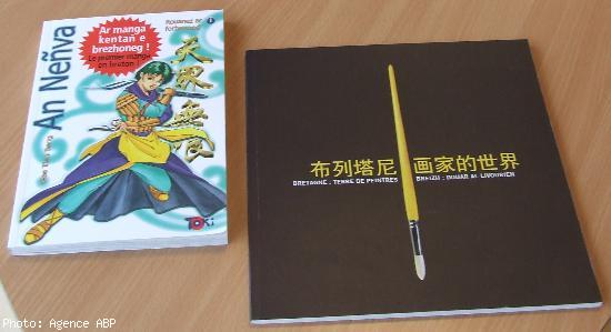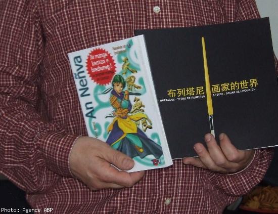 L'autre livre « Bretagne : Terre des peintres, Breizh : Douar al livourien » [photo6] est co-édité par la région Bretagne et l'Agence Culturelle de Bretagne http://www.agence-culturelle-bretagne.com/agence.htm. Ce livre est le fruit d'un voyage en Chine qu'ont effectué des artistes bretons dans le cadre de l'accord de coopération entre la Bretagne et la province de Shandong, pour les vingt ans de cet accord. C'est le superbe catalogue trilingue — chinois, français et breton — (traduction en breton par l'« Office de la langue bretonne » http://www.ofis-bzh.org/) de l'exposition que des artistes de l'association « Spered Kelt » http://perso.wanadoo.fr/panoramanet/pages/Expos/spered_kelt.htm ont réalisée dans le Shandong. Toutes précisions sur http://panoramanet.neuf.fr/pages/Expos/ExpoChine.htm.