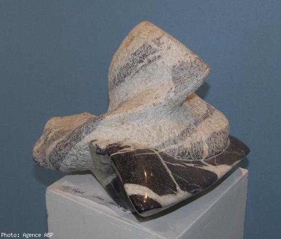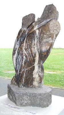 « Vincent Courtin », de Poellgor an Tarv aussi, et de Saint Rivoal, Finistère, sculpte le granit, le kersanton et le marbre. En son impossiblité de venir à Nantes, voici des extraits de http://www.yeun-elez.com/courtin-vincent-saint-rivoal.php : « Depuis 1991, il vit et travaille dans les Monts d'Arrée au contact permanent de la nature qu'il essaie d'intégrer à sa sculpture. » Ses recherches ? « L'équilibre et l'harmonie par le travail de la courbe. La métamorphose infinie des formes. » L'énorme bloc poli de ‹marbre de Bretagne› [photo10] aux veines si intenses, c'est « Spered ar c'heff kozh », Esprit du vieux tronc, et, dans le même matériau, la « Vague » [photo11] est à jamais figée dans la pierre.