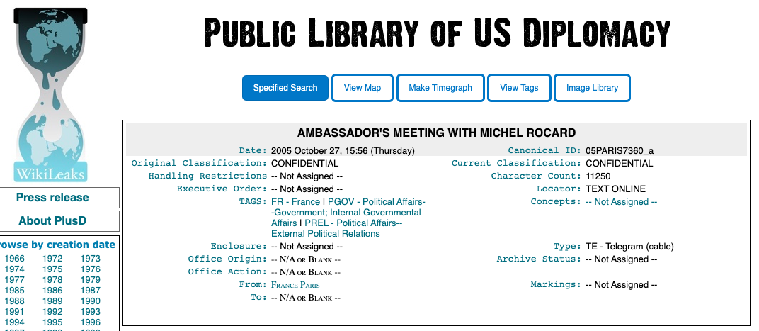 Vu que le fondateur de Wikileaks a été arrêté et que si les États-Unis parviennent à l'extrader, son jugement inclura forcément la destruction des données confidentielles qu'il a publiées sur l'internet, nous avons pensé faire une traduction de cet important aveu pour la postérité sans la retirer du contexte. Voir ici l'original https://wikileaks.org/plusd/cables/05PARIS7360_a.html