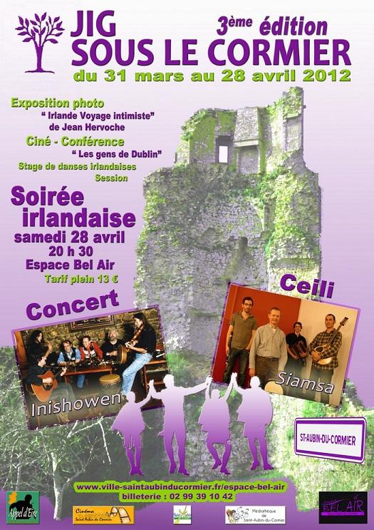 Demain, samedi 28 avril, dans le cadre de la 3e édition de " Jig sous le Cormier " organisée par la très celte association " Appel d'Eire ", se déroulera dès 20 h 30, à l'espace Bel Air de Saint-Aubin-du-Cormier, une grande soirée irlandaise avec concert et Siamsa (divertissement musical, prononcer "sheemsa") http://www.siamsa.org/pages/failte-fr.htm