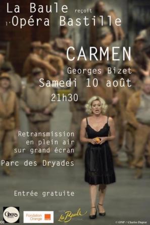 Samedi 10 août à 21 h 30 au Parc des Dryades sur écran géant, son et images HD, retransmission en différé de l\'opéra Carmen de Georges Bizet donné à l\'Opéra Bastille de Paris http://www.labaule.fr/opera-carmen . Durée 3 heures sans entracte.