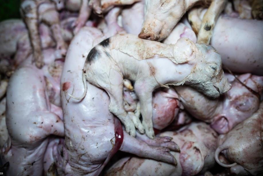 Les truies vivent dans des cages d'un mètre carré chacune. Elles se blessent, se dévorent entre elles quand elles sortent de leurs cages. Elles Elles mettent bas dans des conditions cruelles avec une mortalité des petits très élevée