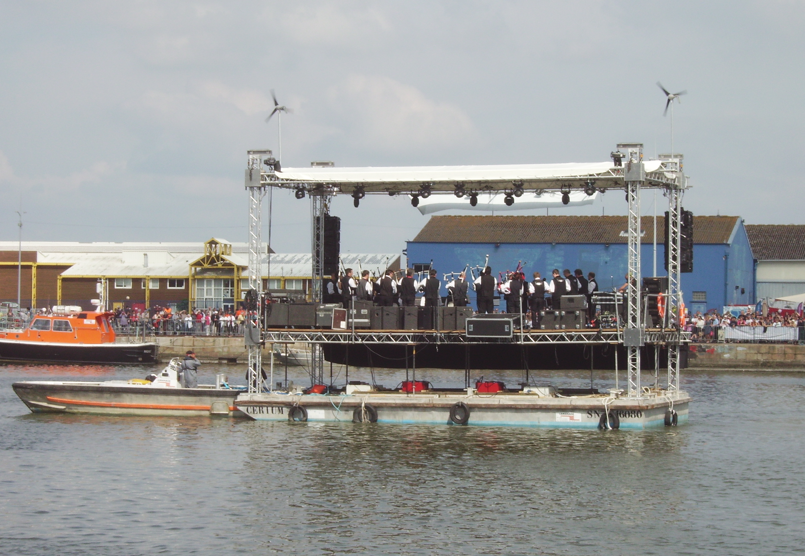 Dans le bassin le bagad Sant Nazer sur le ponton-estrade remorqué par les lamaneurs.