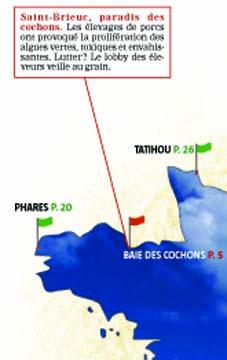 La Bretagne est gratifiée de deux articles, l'un sur les phares, l'autre sur Saint-Brieuc, territoire présenté comme le "paradis des cochons". "Les élevages de porcs ont provoqué la prolifération des algues vertes, toxiques et envahissantes", observe Bakchich hebdo avant de poursuivre : "Lutter ? Le lobby des éleveurs veille au grain".