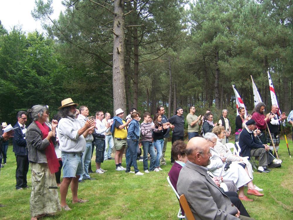 Lancés par Michel Chauvin, les airs bretons du « Kan Bale an ARB » puis du « Bro Gozh ma Zadou » sont repris en chœur par le public. En fin de commémoration, j'ai proposé aux participants de faire une promenade découverte de l'ancienne croix bretonne de 1932, un peu plus loin dans le bois d'Uzel. Là, de nombreuses explications historiques ont été données sur la bataille ainsi que sur le mouvement breton moderne, à un public attentif, tour à tour averti ou néophyte.