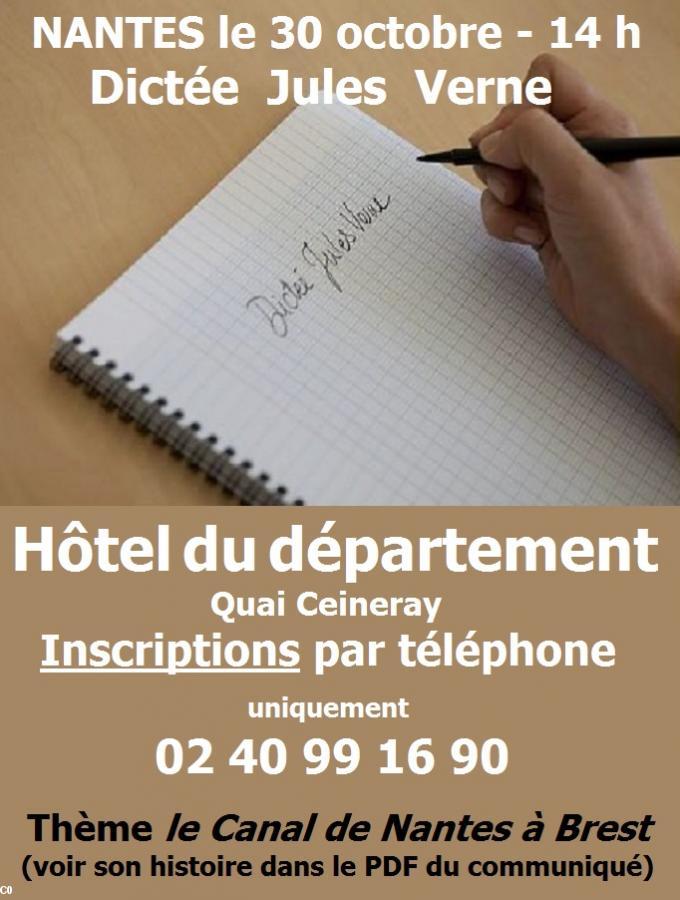 Jean-Pierre Colignon a choisi le thème de la dictée et sera présent pour la lire. Le canal de Nantes à Brest Puisque le Département titre ici (voir le pdf du communiqué) Le Département accompagne les savoirs et les lettres, nous ajoutons qu'il met en valeur cet ouvrage naturel signe que la Bretagne est bien à 5 départements.Extrait du communiqué : [J.-P. Colignon] est une référence en matière d'orthographe. Il est membre d’honneur de l’Académie littéraire de Bretagne (...) depuis 1991. Proche de Bernard Pivot et co-auteur des Dicos d'Or, sa passion pour notre langue l’a conduit à participer à la création de la Dictée Jules Verne en 2005 auprès de l’Académie, du CRDP et du CCO.