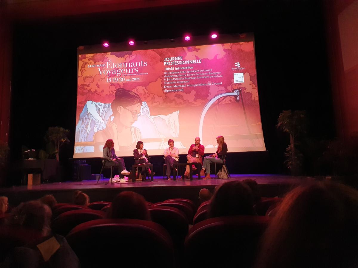 Ce vendredi 17 mai 2024, au Théâtre Chateaubriand de Saint-Malo, la journée professionnelle du salon du livre "Etonnants Voyageurs" avait pour but : Le livre et la lecture par les temps qui courent" à savoir l'érosion des jeunes captivés par les écrans, nécessité d'engager la transmission écologique de la filière, montée en puissance de l'I.A., les enjeux actuels passionnants pour le livre et la lecture ; parions sur l'intelligence collective et la nécessité des professionnelles et professionnels qui s'engagent notamment sur les territoires. Trois tables rondes sont venues croiser réflexions, expériences, et expérimentation.