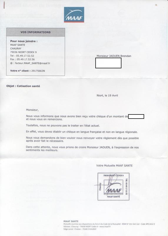 Quelle est longue la route qui mène à la reconnaissance de nos droits fondamentaux et au respect auquel notre langue et ses locuteurs ont droit… Le récent refus par les assurances MAAF d\'un chèque libellé en breton le démontre encore une fois. Ai\'ta ! soutien Brendan, qui s\'est vu refuser son chèque et demande vivement des excuses suite à cette lettre, qui pour nous s\'assimile à de la discrimination. Dans un courrier adressé à l\'entreprise, Ai\'ta ! exige de la MAAF qu\'elle accepte désormais, sans réserve, tous les chèques en langue bretonne. A savoir, Brendan a renvoyé le même chèque en demandant des excuses.