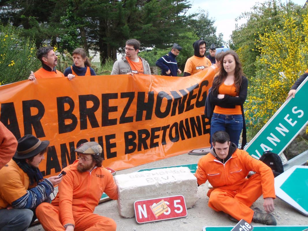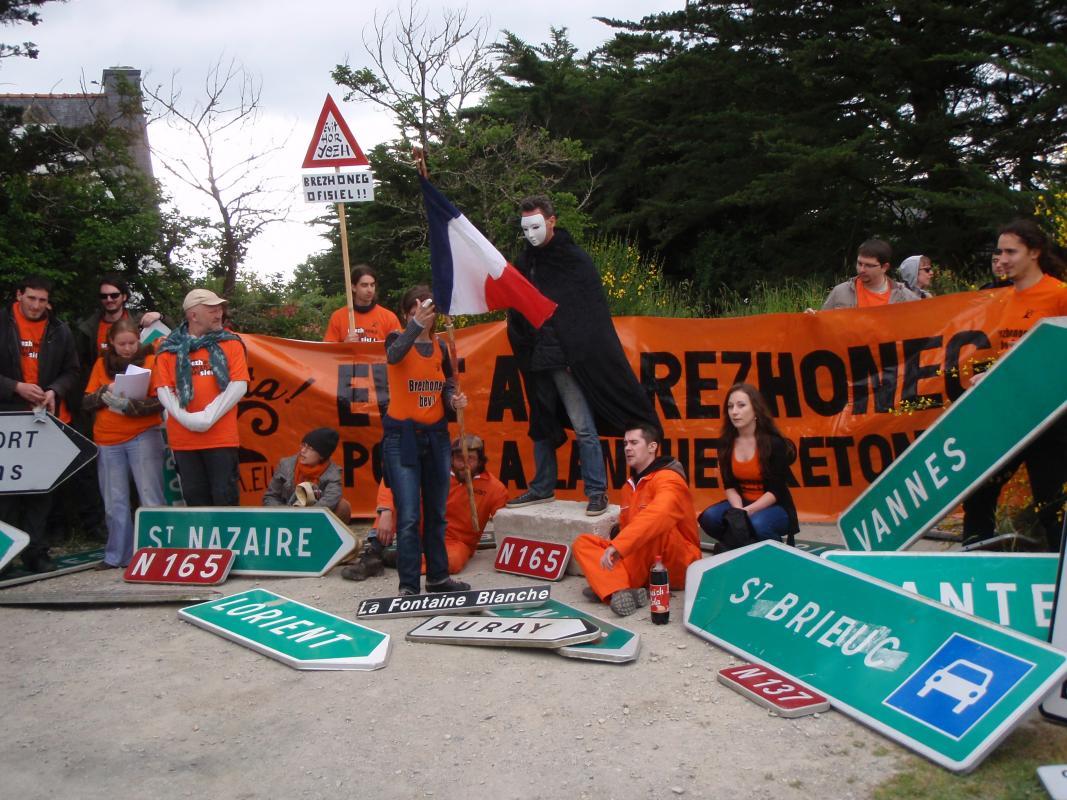 Le collectif Ai'ta ! a organisé ce samedi 25 mai une action de blocage de la résidence du premier ministre à Sarzeau, afin d'exiger que François Hollande et son gouvernement tiennent dès cette année leur engagement de ratifier la charte européenne des langues minoritaires. En signe de protestation, nos militants ont déposé devant le domicile de Jean-Marc Ayrault de nombreux panneaux de signalisation démontés sur les voies express bretonnes. Ces panneaux où notre langue n'a pas droit de cité sont autant de symboles de la répression qu'exerce l'Etat vis-à-vis du breton dans l'ensemble de la vie publique. Nous demandons que François Hollande tienne promesse et que le gouvernement mette enfin en place toutes les politiques indispensables en la matière. Tant que la langue bretonne et ceux qui la parlent ne seront pas reconnus et respectés, nous continuerons et amplifierons nos actions.