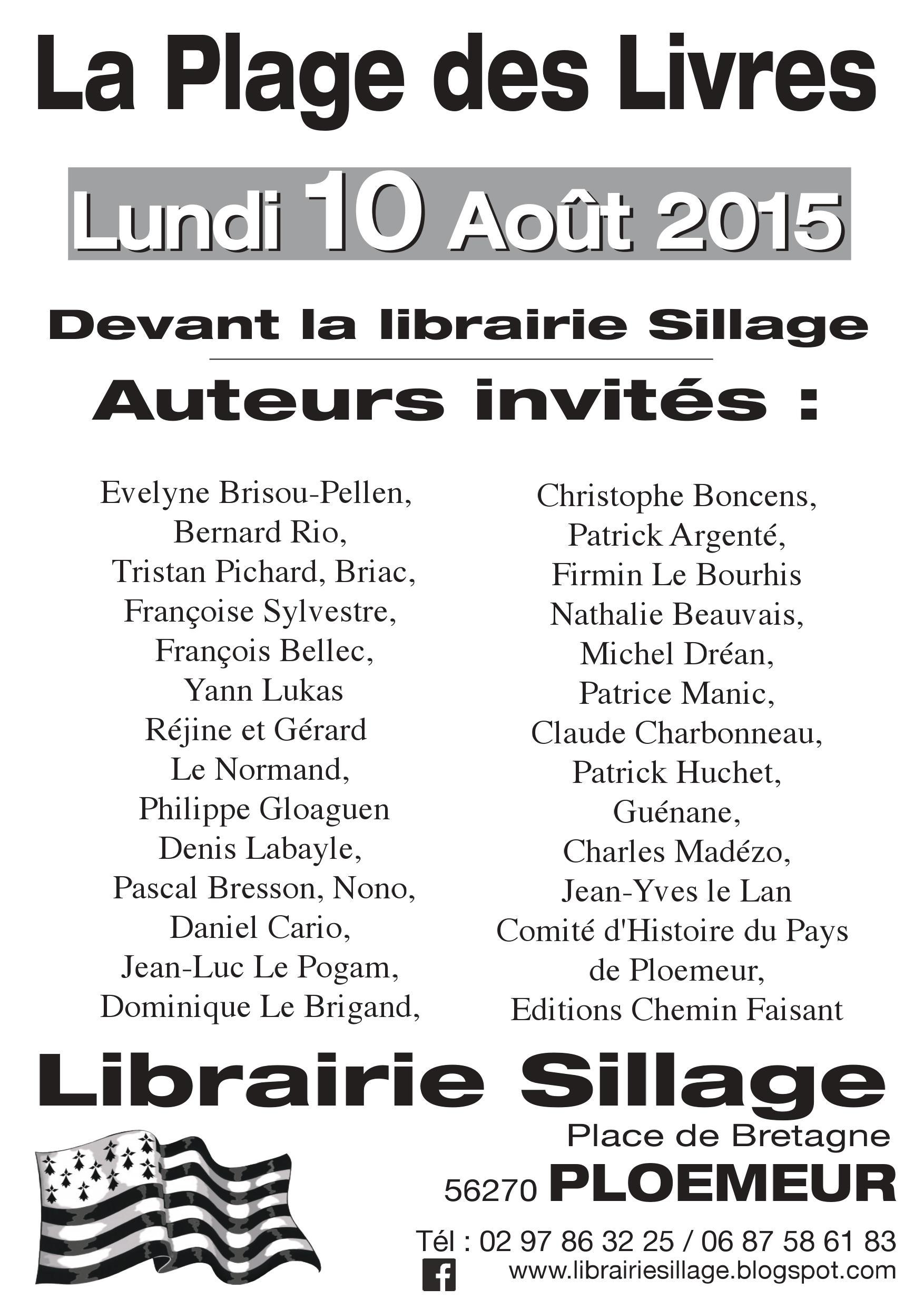 Lundi 10 août 2015, LA PLAGE DES LIVRES, le salon du livre estival de la librairie Sillage à Ploemeur, plus de trente auteurs présents de 10 h à 18h00... entrée gratuite... Grande braderie le même jour à Ploemeur !