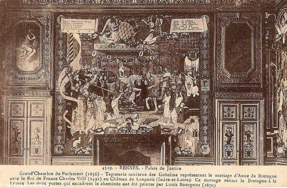 (5) Dix tapisseries du début du siècle, parmi lesquelles cinq pièces réalisées aux Gobelins pour la Grand Chambre, ont disparu dans l'incendie de l'atelier Bobin en 1997. Cet atelier s'était proposé à titre de mécénat d'assurer en un premier temps leur nettoyage. Leurs cartons ont été récemment retrouvés et stockés à l'atelier de restauration à Rennes. Extrait de http://blog.pinsonnais.org/post/2010/04/11/Le-Parlement-de-Bretagne-%283%29b d'Amaury de la Pinsonnais sous licence Creative Commons.