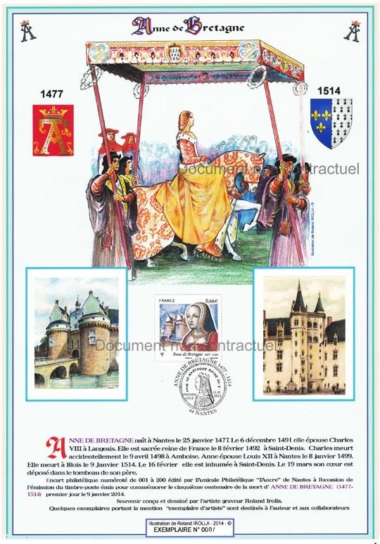 L'amicale des philatélistes nantais L'Ancre et le timbre Anne de Bretagne. Premier jour à Nantes les 11 et 12 janvier 2014