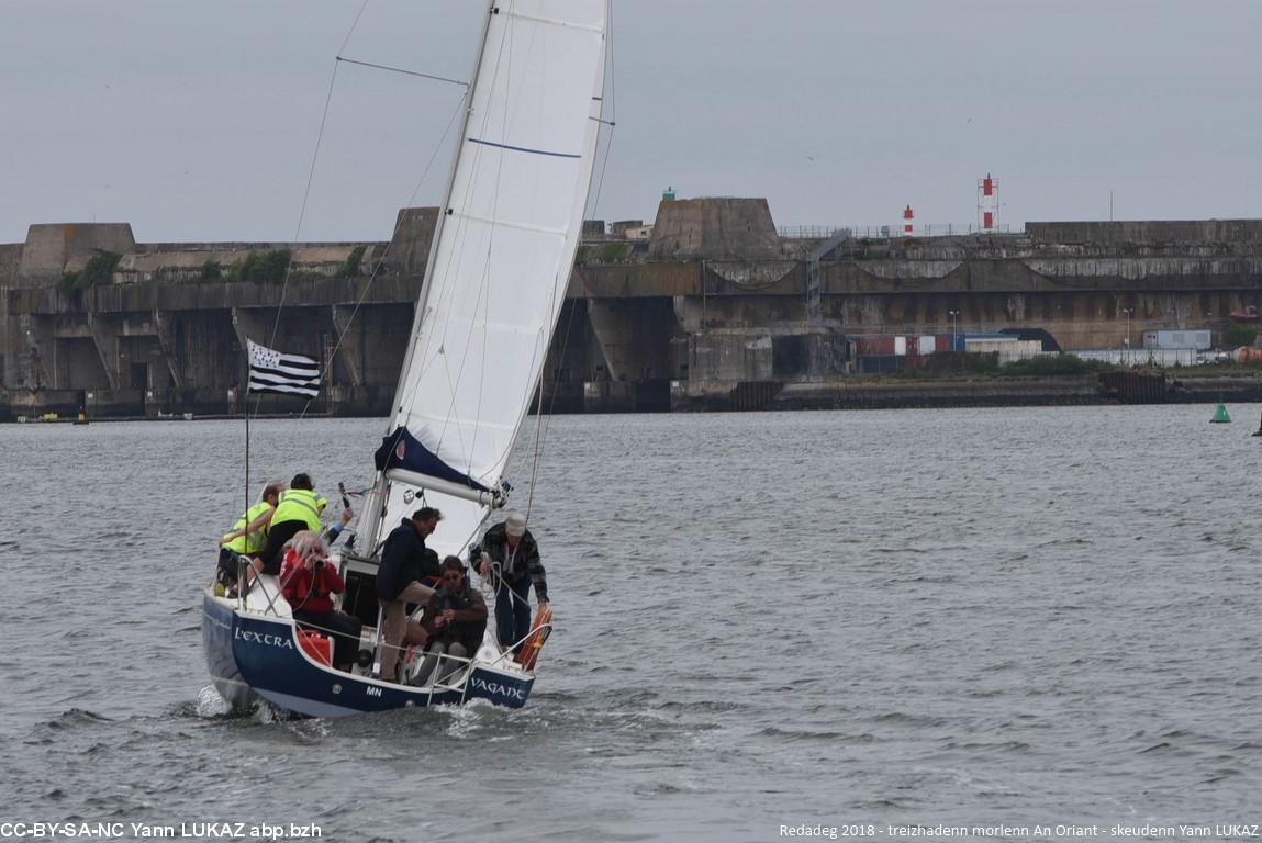 Bientôt, l’« Extra…vagant » surgit, frêle esquif, qui file rapidement sous voile, traçant sa route au mieux des courants venteux et marins, frôlé au passage par la navette « Talhouant », et plus encore par des bateaux-accompagnateurs qui virevoltent autour du prestigieux passeur, guettant le bâton-témoin, maintenu le plus visible possible, en permanence à bout de bras. Haut les cœurs !
