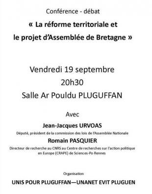 Une conférence aura lieu vendredi 19 septembre à 20:30 à Pluguffan sur la réforme territoriale et le projet d'Assemblée de Bretagne en présence de Romain Pasquier et Jean-Jacques Urvoas.