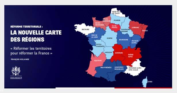 http://www.elysee.fr/communiques-de-presse/article/reformer-les-territoires-pour-reformer-la-france/ du communiqué de l'Élysée publié ce soir vers 21 h. La nouvelle carte avec seulement quelques fusions de régions comme la réunification de la Normandie ou la fusion des régions Alsace et Lorraine ou Languedoc avec la région Midi-Pyrénées, laisse intactes les régions Bretagne et Pays-de-la-Loire.Guerre intestine au PS