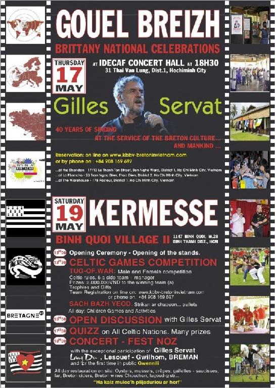 Gilles Servat se produira en concert à la salle de l'Idécaf. Adresse : 31 Thai Van Lung, District 1, Ho Chi Minh city, Vietnam le jeudi 17 mai à partir de 18 h 30 et au cours de la kermesse de la Gouel Breizh qui se déroulera au parc de Binh Quoi II le samedi 19 mai.