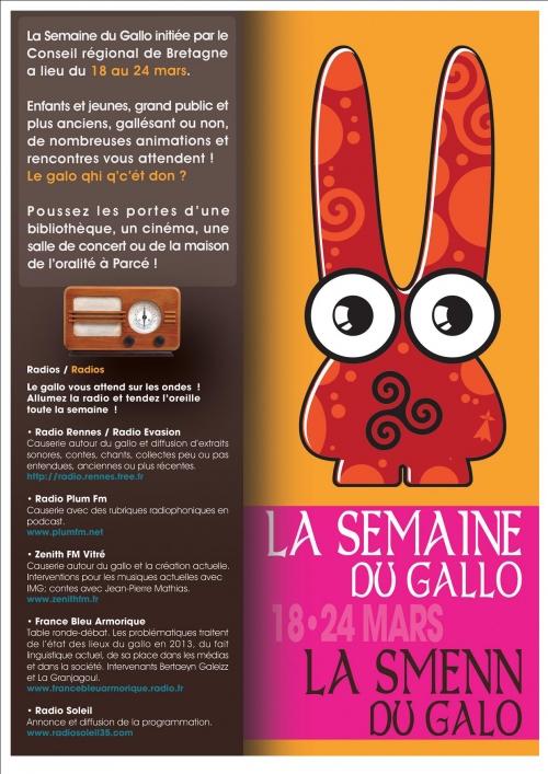 La Smenn du Galo/Semaine du Gallo, initiée par le Conseil Régional de Bretagne, a lieu pour la première fois en 2013, partout en Bretagne du 18 au 24 mars.