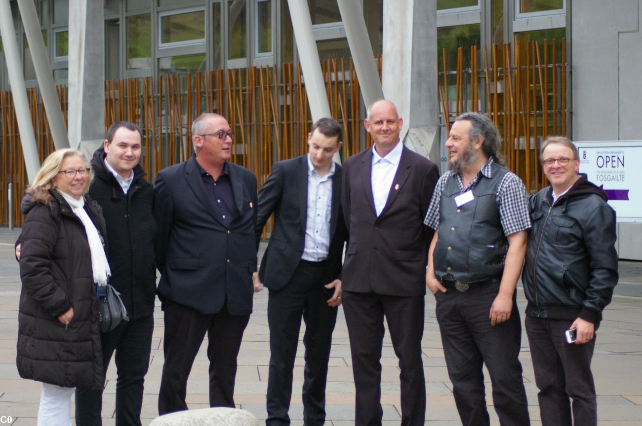 - Sur la terrasse du Parlement Ecossais, avec le député Willie Rennie (démocrates libéraux écossais) et l'eurodéputé catalan Dr. Josep-Maria Terricabras.