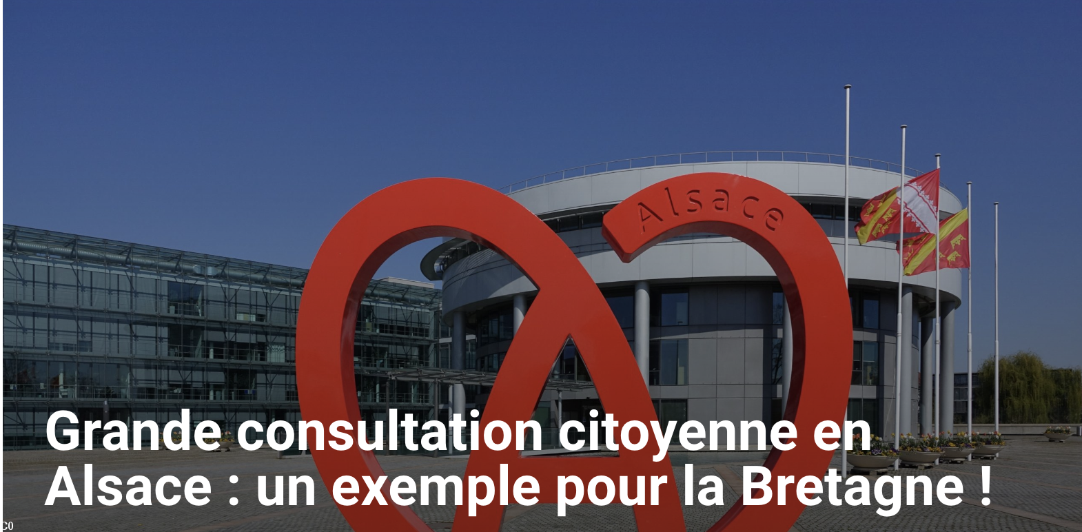 L’Alsace lance une « grande consultation citoyenne » pour un modèle original de régionalisation : une expérience qui devrait inspirer la Bretagne En janvier 2023, la Collectivité européenne d’Alsace, issue de la fusion des anciens conseils départementaux du Bas-Rhin et du Haut-Rhin, avait organisé une consultation citoyenne sur la question de la reconstitution d’une Région Alsace à part