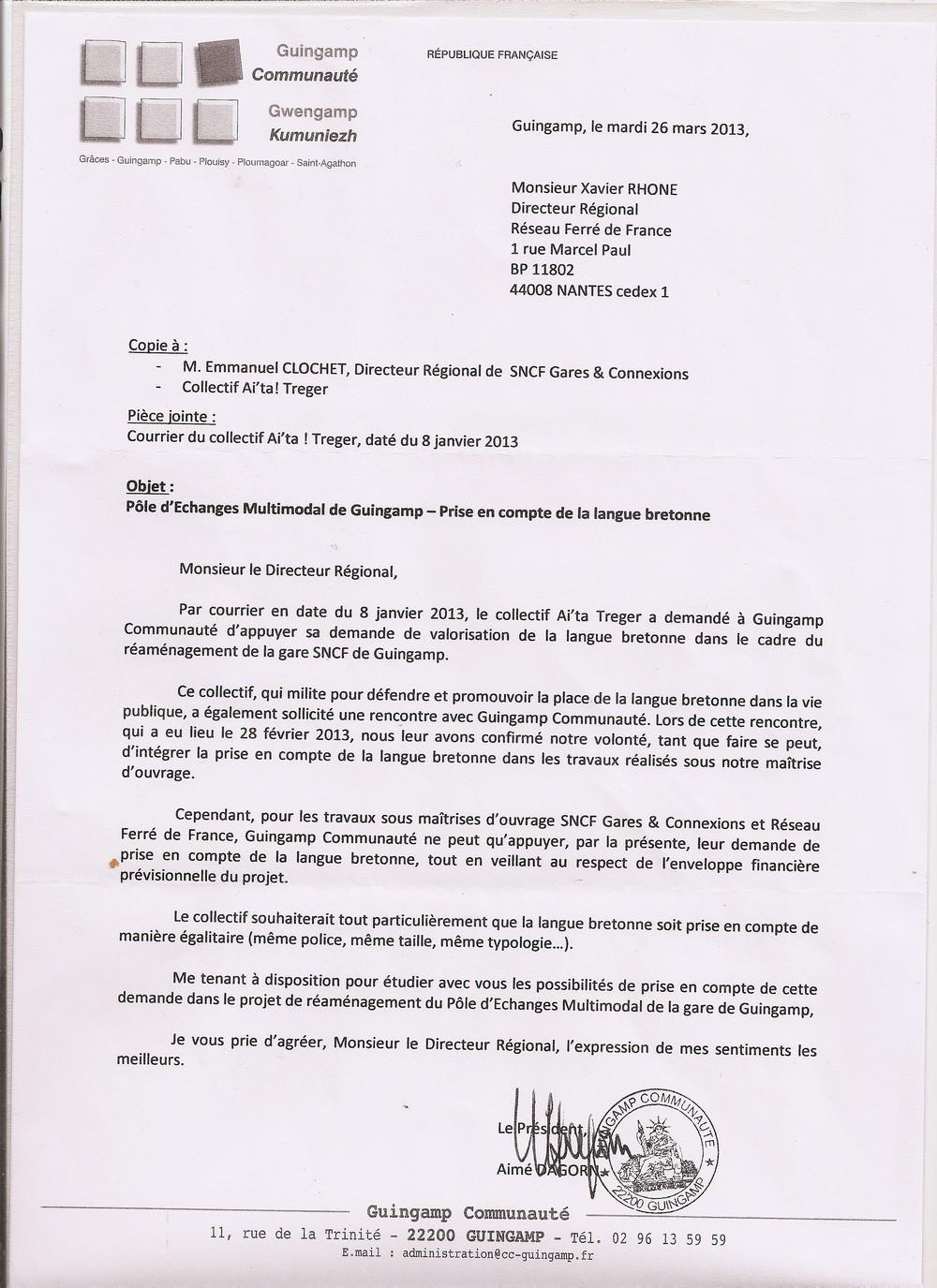 Nous publions ci-joint une lettre reçue suite à une rencontre avec les élus de la Communauté de Communes de Guingamp, dans le cadre des travaux d'extension de la plus grande gare du Trégor. C'est un exemple du travail régulier et silencieux effectué par les militants d'Ai'ta ! Nous resterons très attentifs à la suite de ce dossier, à Guingamp comme ailleurs.