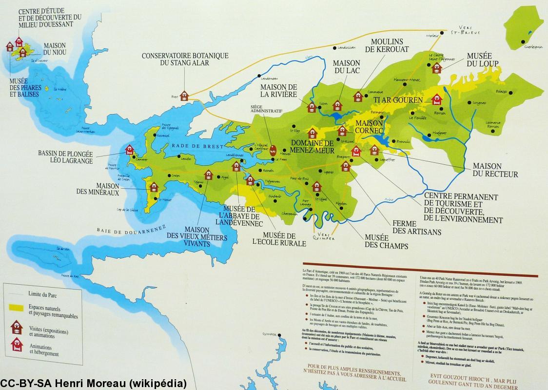 (1) La presqu’île de Crozon est un des quatre territoires du Parc naturel régional d'Armorique. Créé le 30 septembre 1969 par le ministère de l’Environnement, il est l’un des deux parcs naturels régionaux de Bretagne, l’autre étant celui de Brière, créé le 16 octobre 1970. S’y ajoute le 28 septembre 2007 le parc naturel marin d'Iroise. Un parc naturel régional du Golfe du Morbihan est en projet depuis janvier 1999.