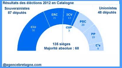 Mis à jour le 26 nov à 09:00. Les indépendantistes du centre droit de la Convergencia i Unio (CiU) et de la gauche indépendantiste et des verts (ICV) ont remporté aujourd'hui une large victoire en obtenant 87 des sièges de la Generalitat. Si la CiU perd une douzaine de sièges (50 au lieu de 62 en 2010) et reste majoritaire avec 30,66% des votes, la gauche indépendantiste en gagnerait une dizaine (20 contre 10 en 2010 soit 13,68%). Les verts de l'ICV qui sont aussi souverainistes en gagnent 3 avec 13 sieges. S'il y a un glissement de la droite indépendantiste vers la gauche indépendantiste, les indépendantistes confortent leur gain. Le grand perdant est le parti socialiste (PSC) qui n'aura plus que 20 sièges soit 14,44%. Le parti populaire (PP) a 19 sièges et gagne un siège (13%). Le nouveau parti CUP, gauche alternative, obtient 3 sièges. Au total les indépendantistes, gauche/droite confondues, ont obtenu 87 sièges. Les indépendantistes sont donc majoritaires car ils occupent 87 des 135 sièges (http://www.parlament2012resultats.cat/09AU/DAU09999CM_L1.htm catalan des résultats).