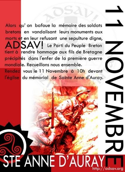 Alors qu'on bafoue la mémoire des soldats bretons en vandalisant leurs monuments aux morts et en leur refusant une sépulture digne, Adasv! le Parti du Peuple Breton tient à rendre hommage aux fils de Bretagne précipités dans l'enfer de la première guerre mondiale. Recueillons-nous tous ensemble.