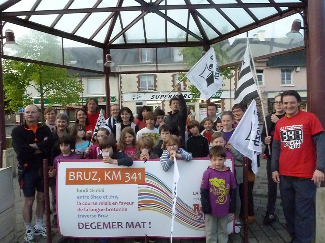 De retour sur le kiosque de la place de la mairie, les courageux coureurs se restaurent en prenant un petit-déjeuner organisé par la mairie de Bruz qui montre son soutien et son attachement à la charte Ya d'Ar Brezhoneg (niveau 2). Ils sont ensuite rejoints par d'autres coureurs de l'association bruzoise BRUZHONEG qui viennent de parcourir le 344ième kilomètre.
