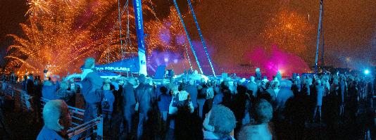 Ce soir, à partir de 20 h 30, a débuté le moment fort de cette semaine nantaise, un rendez-vous attendu par le skipper Pascal Bidégorry, l'ensemble du Team Banque Populaire et les acteurs du projet. À la tombée de la nuit, la magie a envahi le site pour le baptême du Maxi Banque Populaire V. Pour le public attendu très nombreux à Nantes, le baptême était visible depuis les quais de la Fosse et de l'île de Nantes où plusieurs écrans géants étaient installés pour ne rien manquer du spectacle qui devrait prendre fin vers 21 h 30.