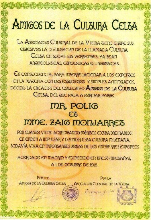 Polig Monjarret vient de recevoir à titre posthume une distinction de la main de représentants Galiciens de l'Ordre de Vieiria pour son oeuvre immense envers le monde interceltique (voir en