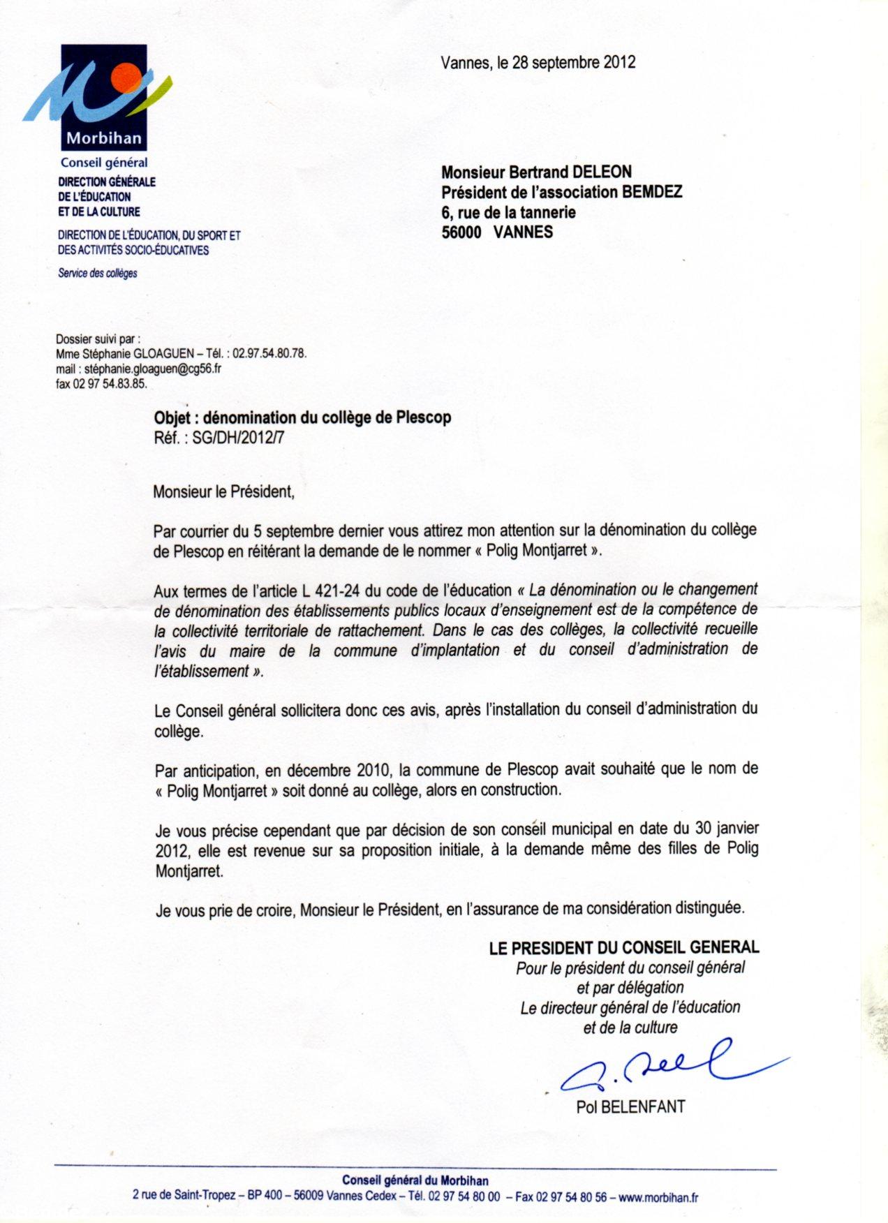 Polig Monjarret vient de recevoir à titre posthume une distinction de la main de représentants Galiciens de l'Ordre de Vieiria pour son oeuvre immense envers le monde interceltique (voir en pièce jointe). Une bonne nouvelle en annonce une autre, le Conseil général du Morbihan vient de nous faire part de son attention de solliciter à nouveau ce nom pour le collège public du Pays de Vannes à Plescop (courrier en pj également). Ce courrier est d'une grande importance quant à la dénomination du collège : il s'appuie sur la loi concernant la dénomination des collèges pour conclure qu'il suffit que le conseil d'administration de l'établissement ou/et la maire de la commune réitère cette volonté. Or, cette réponse rebondit sur nos propos tenus le 5 septembre dernier lorsque l'association culturelle bretonne Bemdez réitérait auprès du Conseil général la demande initiale de nommer cet établissement Polig Monjarret. Nous rappelions qu' “aucune polémique aussi stérile que déplacée, de surcroît d'une poignée d'individus mal intentionnés, ne doit faire obstacle à la mémoire du travail de cet homme dans la reconnaissance et le développement de notre identité. Reculer face aux rumeurs mensongères à son endroit serait un manque de courage politique et surtout une absence de dignité. Polig Monjarret a permis l'épanouissement de milliers d'hommes et de femmes dans leur culture, notamment à plusieurs générations de musiciens de se produire publiquement. Enfin, il est important de souligner que la famille de Polig Monjarret avait demandé l'arrêt de la polémique pour faire cesser les insoutenables accusations portées sur leur père. La peine et la souffrance de la famille restent entières et elles n'attendent en fait que justice soit faite par la nomination de ce collège public par le nom de leur père, initialement proposé. Il en va de la droiture, de la dignité et du respect de chacun de ne pas reculer face à la calomnie de quelques olibrius haineux.” Par ailleurs, nous nous sommes attelés à démontrer ces derniers mois qu'appliquer le retrait du nom de Polig Monjarret sur des accusations diffamantes justifierait la suppression d'un pourcentage important de nos noms de rues, places et bâtiments publics, à partir cette fois de faits notoires et vérifiés dans le même registre. Tous les feux sont au vert, il n'y a plus qu'à se réjouir de l'application logique du souhait initial et partagé, exprimé officiellement en décembre 2010 : le nouveau collège public du Pays de Vannes s'appellera sans conteste Polig Monjarret. Pour Bemdez, Bertrand Deléon.