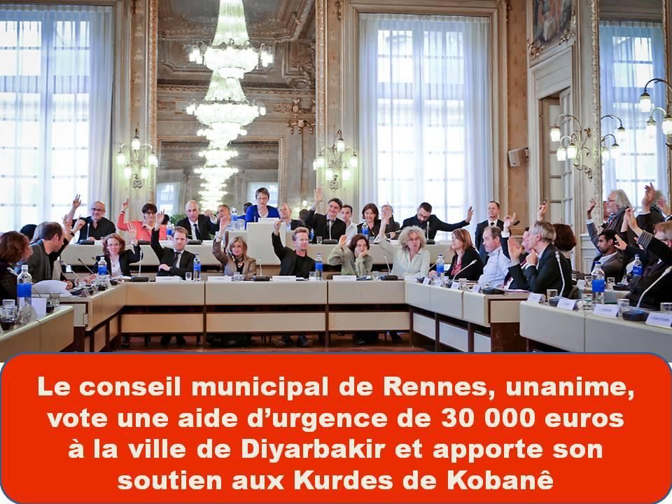 Nathalie Appéré, Députée-maire de Rennes, a proposé au conseil municipal de Rennes, réuni le lundi 13 octobre en séance publique, de voter une aide d'urgence de 30 000 euros à la ville de Diyarbakir avec laquelle une coopération existe depuis de très nombreuses années, pour améliorer les conditions d'accueil des réfugiés kurdes qui ont fuient le Rojava, le Kurdistan syrien, notamment le canton de Kobané qui résiste farouchement depuis plusieurs semaines aux assauts répétés des forces djihadistes de l'Etat Islamique (Daesh). Cette proposition d'aide humanitaire a été précédée d'une déclaration de soutien au combat que mènent les Kurdes de Kobanê "assiégés par des terroristes" :