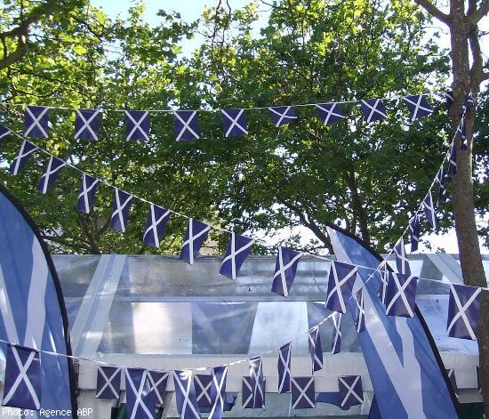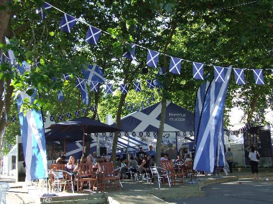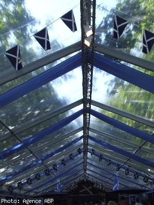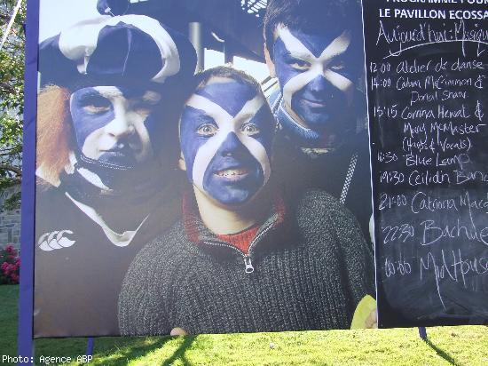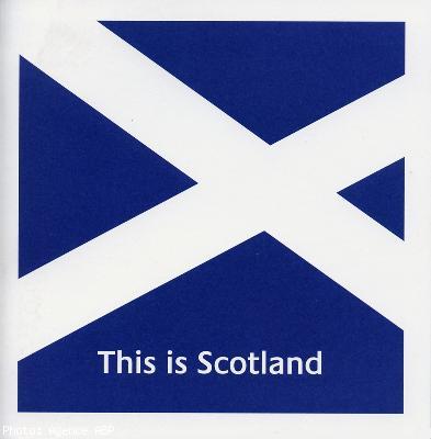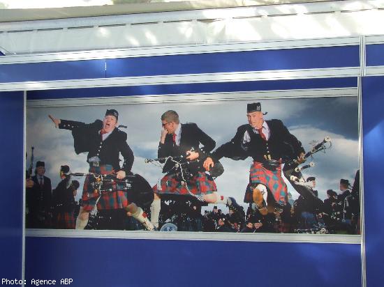 Le pavillon de l'Écosse sous les arbres, tant dehors (2) que dedans (3) est bleu, blanc, vert. L'Écosse en photos géantes (4) y étale sa fougue encadrée de bleu ou en brochures variées, toutes de qualité (5). Le saltire est partout (6, 7).