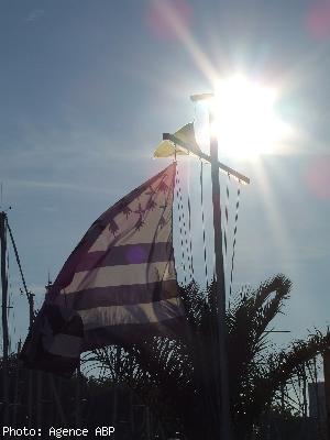 La ville a acquis de nouvelles barrières de rues et de port (8). De quelle couleur sont-elles ? L'école de voile pavoise, elle, en orange et jaune. La double coque noire du Pen Duick 2 est traversée par le blanc de la flottaison (9). Le soleil a éteint la couleur du ciel et le Gwenn ha du n'est plus très gwenn (10). Produit en Bretagne flotte au vent, un coup à l'endroit, un coup à l'envers (11).