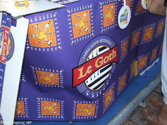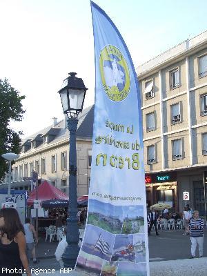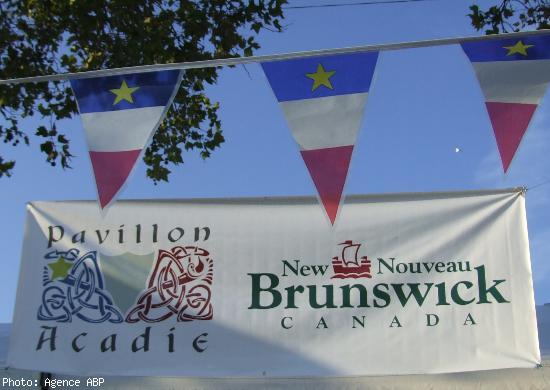 Avec le pavillon de l'Acadie, résolument francophone dans la province canadienne, officiellement bilingue, du Nouveau-New Brunswick, on trouve un peu de rouge. L'étoile dorée, stella maris ou étoile de mer, du drapeau tricolore adopté le 15 août 1884, y symbolise la Vierge - patronne et protectrice de l'Acadie - et la foi catholique romaine du peuple acadien (15). Dorée aussi, et bleu roi (16), la nappe du stand des gâteaux bretons artisanaux au caramel au beurre salé, lauréats 'meilleure nouveauté 2007' de Produit en Bretagne.