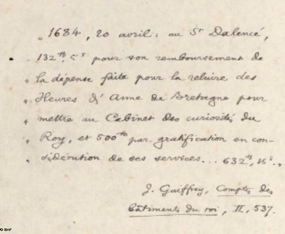 - Reliure du Grand livre d'Heures d'Anne de Bretagne. Note de Jean Guiffrey glissée dans le livre (Compte des bâtiments du roi, vol. 2, p. 537)